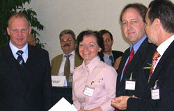 Frau Dipl.-Ing. Ann-Kristin Liebscher bei der Verleihung. Links Herr Kai Seppeler, rechts Dr. Andreas Schütz und Prof. Bernd Isecke